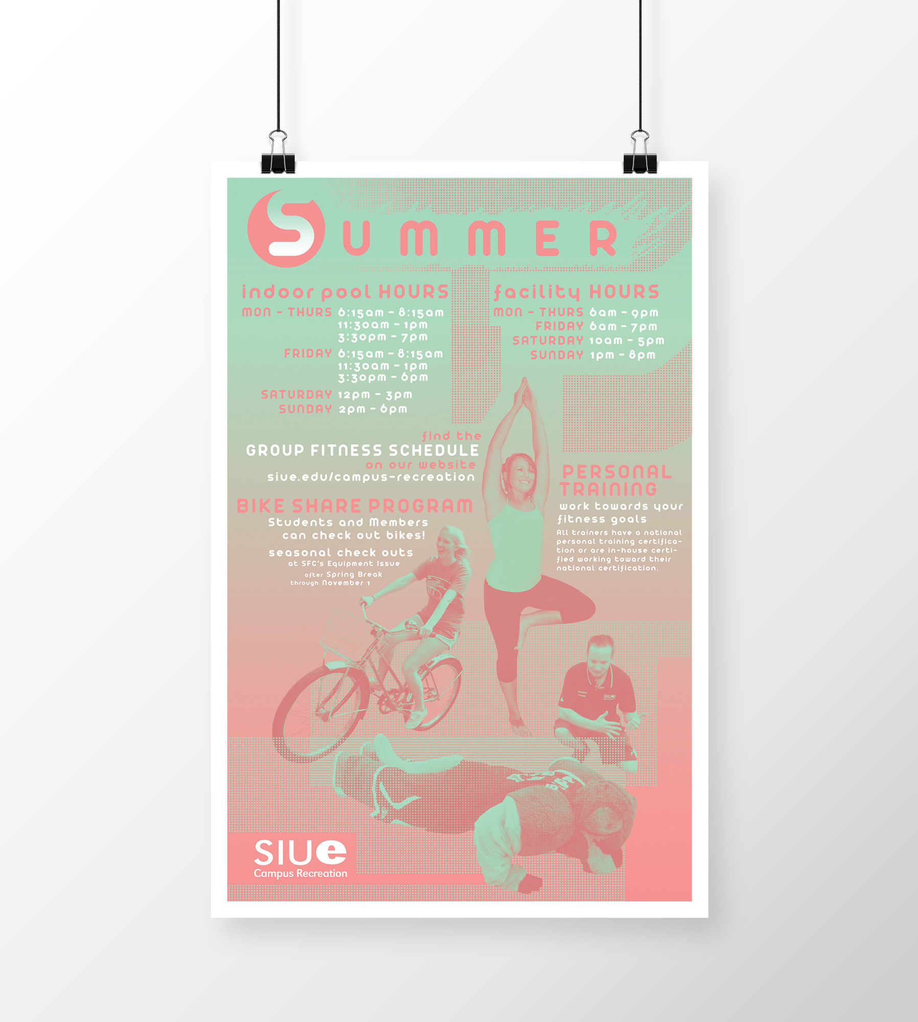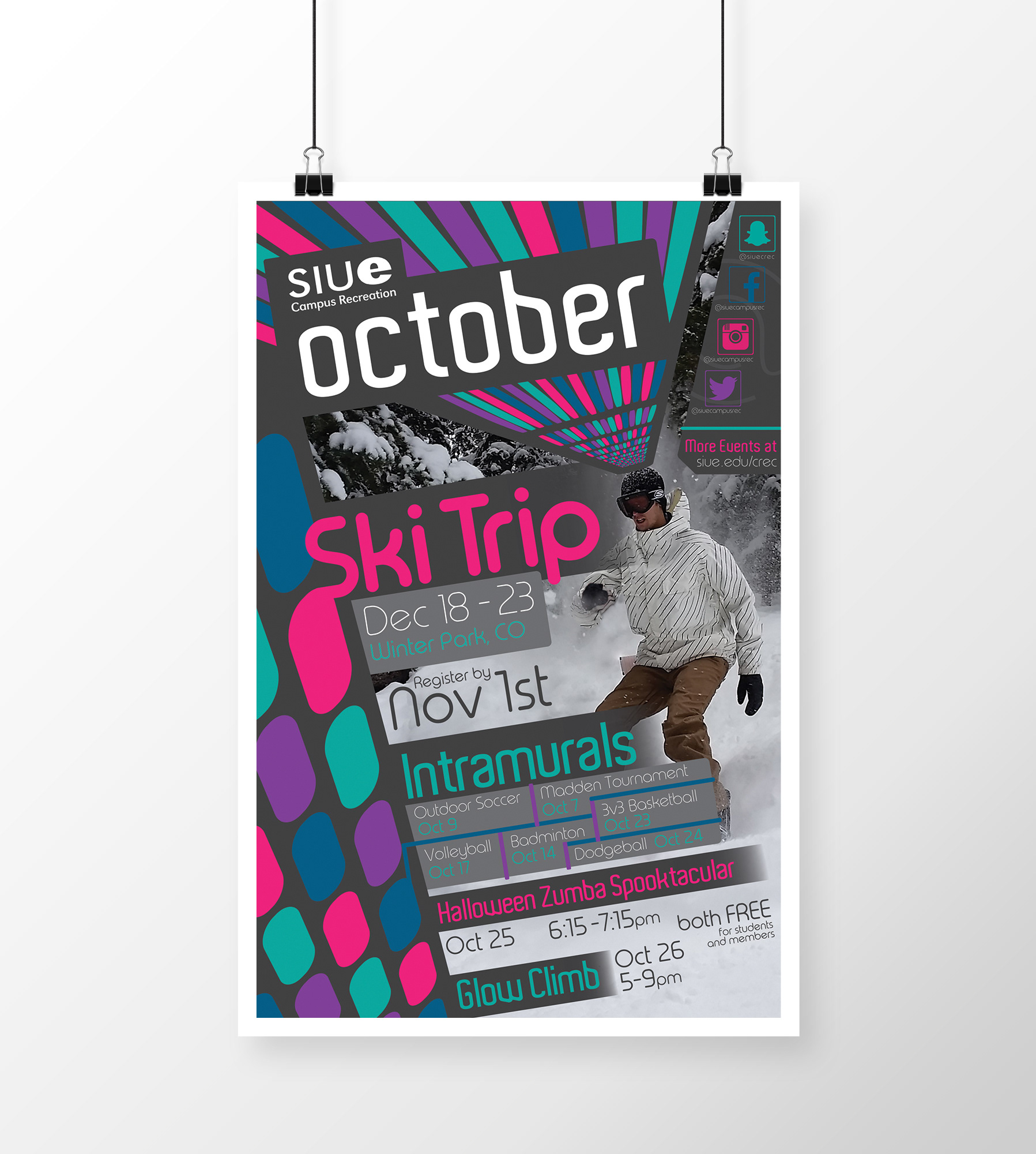 Monthly Posters (11 x 17) informing the student body at the Student Fitness Center of upcoming events and of SIUE Campus Recreation's online presence. These were also an exploration of applied texture/pattern in the context of functional posters.